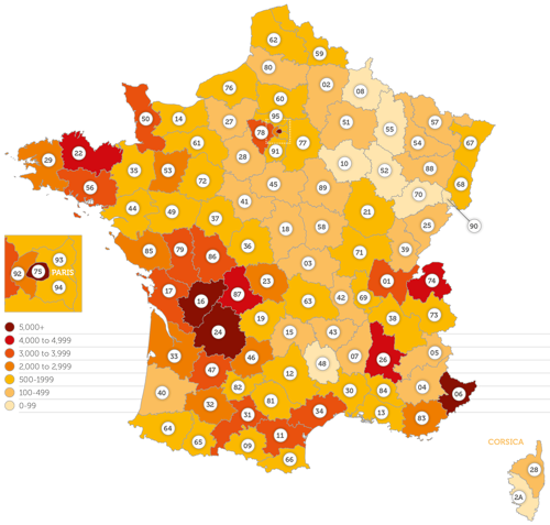 The map of France is very different. British expats are dispersed across every department of mainland France, with concentrations of 5,000 or more in the northwest, southwest, southeast and Paris. The only area noticeably light on Britons is the northeast, where the weather and the lack of a desirable coastline have something to do with it. Take a look at our findings below!