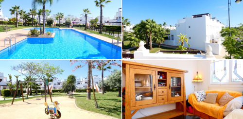 This corner townhouse has two bedrooms, one bathroom, a fully-equipped American-style kitchen, a garden and large roof terrace. It's located in a private residential area, and is very close to the communal pool. On the market for £75,500 - find out more here.