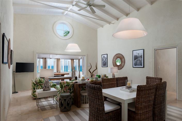 A delightful covered wooden dining terrace joins the indoors with the outdoors. The traditional Caribbean shutters make this a cool place to enjoy a meal.