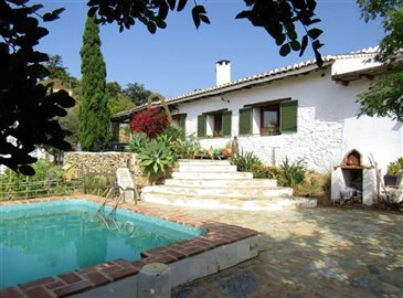 Composé d'une maison principale de 3 chambres, 2 salles de bains et d'une annexe séparée de 1 chambre, 1 salle de bains, le domaine a environ 65 000 m2 sur plusieurs coteaux, de la zone plate autour de la maison elle-même, plongeant dans la vallée, où des grappes d'arbres fruitiers , des chênes et des pins locaux peuvent être trouvés. Il existe de petits chemins et pistes qui permettent d'accéder à la plupart des parties du domaine. La propriété dispose d'une allée menant à un grand parking et d'un accès aux jardins immédiats, à la maison principale et à la casita des invités.