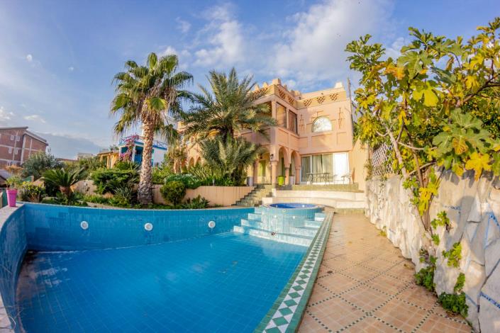 On the ground floor there is a traditional Moroccan-style kitchen with built-in niches that house the household appliances needed for the household. The space of the hookah room, when opening the stained-glass window screen, unites with the landscape of the pool.