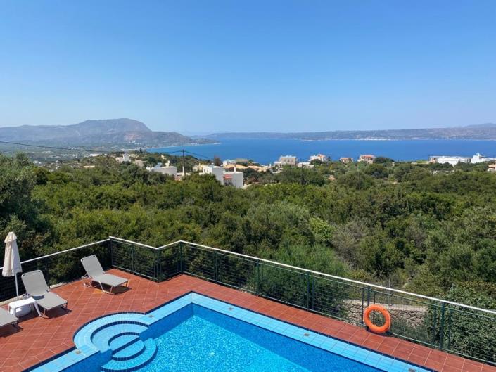This 3 bedroom 2 bathroom villa has an EOT licence and is located in quiet and serene settings with stunning, unobstructed sea and White Mountain Views. The ground floor comprises open plan fully fitted kitchen/dining/living area, one double bedroom and a wet room WC where the washing machine is housed. The living room and kitchen have French doors leading on to a shady covered balcony overlooking the pool and breathtaking views of Souda Bay. Stairs rise to the 1st floor with 2 double bedrooms and family bathroom with tub and fitted telephone shower. There is a huge tiled terrace upstairs with even more breath-taking views over Souda Bay and the White Mountains.