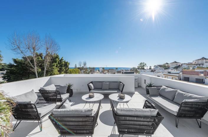 Absolutely stunning and completely unique family home on located on the super exclusive Golden Mile, in Marbella. Situated just 180 meters from the Beach and several beach front restaurants, this completely refurbished Townhouse has been renovated to the very highest of standards, distributed over three levels, with the kitchen and social areas on the entrance level, together with the 4th bedroom. On the first floor you find a beautiful master suite with walk-in wardrobes, and its own beautiful bathroom en-suite. On the other side of the hallway there are two further bedrooms which are share another very spacious and beautiful bathroom. On the upper floor you find what is presently a second living room, which is connected to a very fabulous south west facing terrace complete with a heated plunge pool. This room could vert easilly be converted into a luxury 5th bedroom if required. From here you have access to the roof top terrace which is, quite simply, stunning! Offering unique views toward the sea, and the iconic La Concha mountain behind. This property is arguably one of the best properties available within this budget on the Golden Mile right now, and is an absolute must view for anyone wishing tio live life without relying on a car!