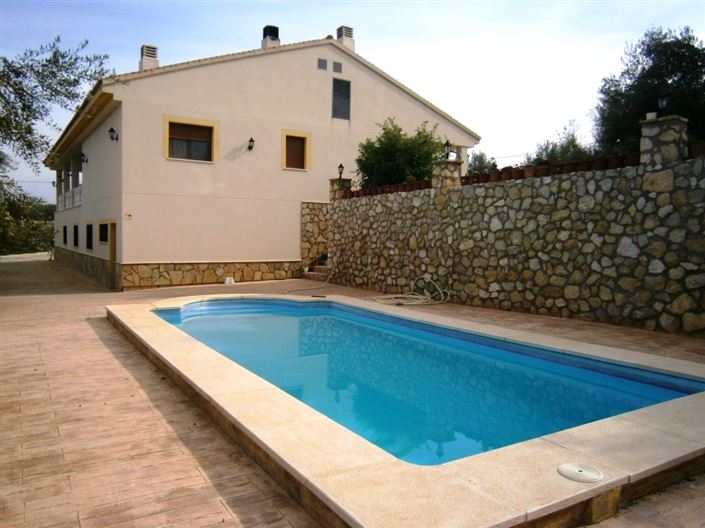 Large country house of 500 m2 built with wonderful panoramic views, situated 5 minutes from the village of L'Alqueria de Aznar, 10 minutes from the nearest town and 50 minutes from the coast. It is a double storey property, is in excellent condition having recently been built on a high standard inside and out. It features of 3 double bedroom with fitted wardrobes, a master bedroom with on-suite bath and fitted wardrobes, large lounge / dining room direct access to the back covered terrace which has stunning views down to the valley. The property has a modern style kitchen with utility area. Downstairs there is nice shower room and the rest is an open space currently used as a garage. That could easily be converted in more living space or a separate accommodation. This property benefits of agricultural water, mains electricity, double glazing throughout, available internet connection, pre-installation of air conditioning, oil central heating and a wood burning stove in lounge area. Sits within a generous plot of 8,781m2, which is fenced around the house complete with a lovely private swimming pool. There is an attractive low maintenance garden area around the house with plenty of trees for shade. The rest of the land is mostly growing olive trees.