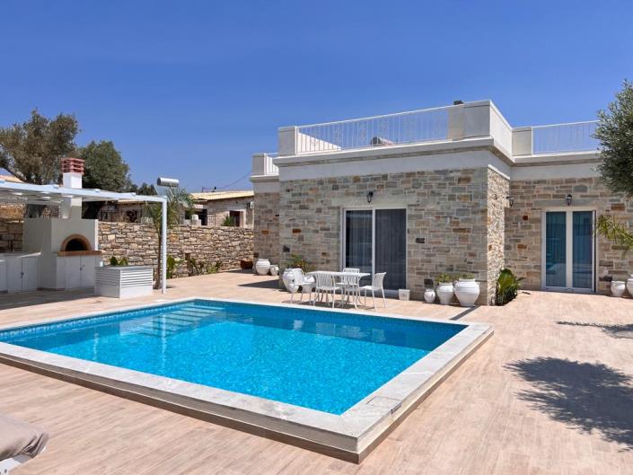 This modern stone built villa is currently under construction and will be ready in Spring time. This one level villa will have 2 bedrooms with ensuite bathrooms, a WC and an open plan living room and kitchen area. The villa is built with a combination of stones and modern tiles. Large openings lead to the interior swimming pool and BBQ area where anyone can enjoy the sunshine, the beautiful exterior area and views of the mountains and the town of Pitsidia. All rooms will have AC and installation for radiators. The villa will be sold completely furnished. It is located on the outskirts of Pitsidia only a few minutes walking distance to the main square and close to cafes and shops.
