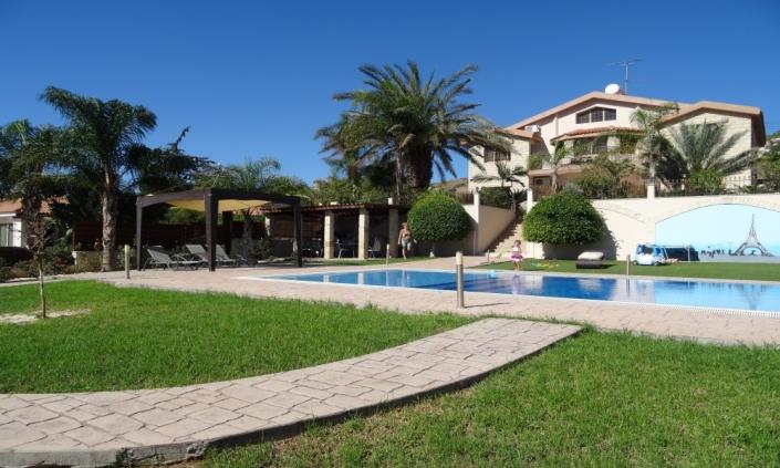 Sliding doors lead to a spacious outdoor seating area with a BBQ, swimming pool 5x10 m, and garden areas of 3100 sqm. There are lemon, tangerine and pomegranate trees with fruits in the garden.