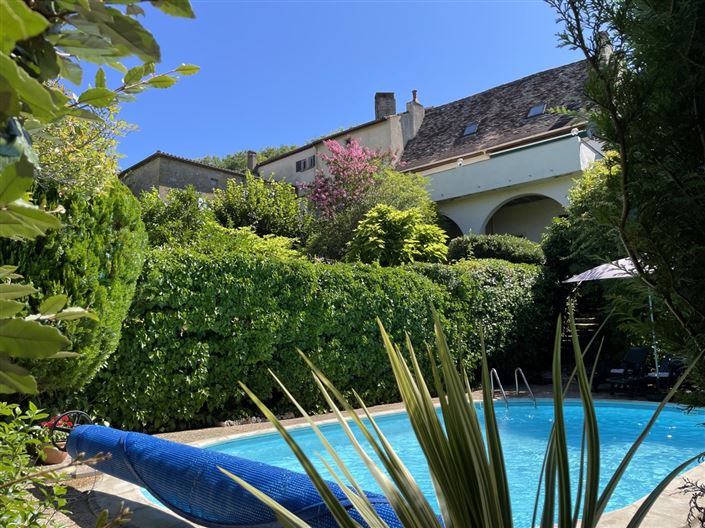 UNiQUE STONE HOUSE (aprox 209m2) with a large BALCONY and sunset views over this village, its terraced garden and SWiMMiNG POOL. There are 3 bedrooms, 2 shower/bath rooms, 3 WC. At the main level there's an open dining /salon with a stunning STONE FiREPLACE, a seperate kitchen, shower room with toilet and a bedroom. Upstairs there are 2 bedrooms and a WC. A new staircase leads to the basement, there is an extra entrance also leading to a renovated large living room with exposed features, which gives also access to the gardens and the pool. GAZ CENTRAL HEATiNG AND ELECTRiC RADiATORS. At this level you have also a laundry room/back kitchen area and new bathroom/WC. You are at a foot stone from BAKERS & AMENiTiES in this picturesque village of Couse et St-Front & Lalinde ! These villages follow the RiVER DORDOGNE AND its 13 ancient MiLLS ! Airport Bergerac at 20 Min drive only !