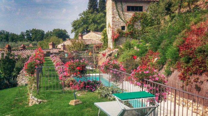 Tuscany country resort with a historical stone house, a medieval mill, land and pool for sale in Castellina in Chianti, Siena. Nestled in the beautiful Chianti hills, a few kilometers from Castellina in Chianti, in one or the most sought-after places in Tuscany, surrounded by centuries-old woods and rows of Sangiovese vines, an enchanted place where the sound of the water sounds an harmony of peace and tranquility. Masterfully restored from what was once, as early as the early Middle Ages, used as a mill to grind the crops of Chianti farmers. The restoration has made it possible to create four apartments from the main building, and two independent houses, once the mills of the place, for a total of thirteen rooms and eleven bathrooms. Each unit is self-contained with living areas equipped with fully fitted kitchen and dining. Each room revives its original features, from the exposed stones to the wooden beams and traditional terracotta floors. Around the remains of the old mill, a swimming pool and several terraces have been built for outdoor living. Every year guests and visitors choose this place for their relaxing vacations. The property is complemented by 10 hectares of land, mostly forest, as well as a small vineyard and an olive grove.