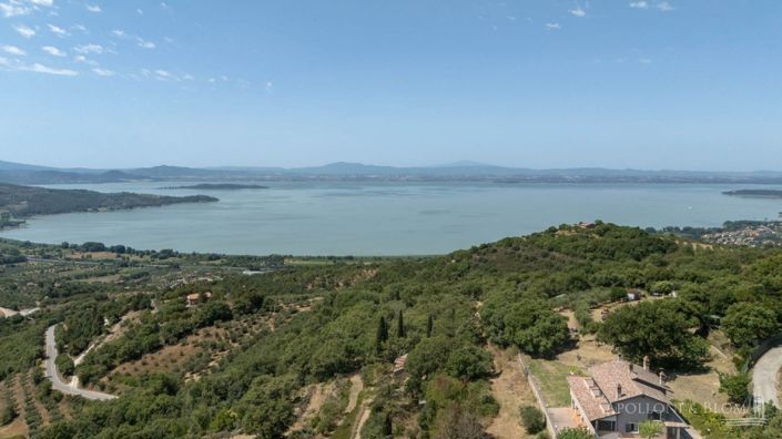 Unique setting with open views over the lake, contemporary-style and solar energy, panoramic porches and garden for sale in Passignano sul Trasimeno. Commanding an unrivalled position with sweeping views over Lake Trasimeno, this 572 sqyìuare meters villa in Passignano sul Trasimeno offers a rare combination of space, light, modern comfort, and eco-conscious design. Built in 1996 and immaculately maintained, the property spans three levels—two above ground plus a versatile basement—where every detail reflects quality craftsmanship. From the moment you arrive via the private, gated driveway, the scene is set for refined living. The fully fenced 1,300 square meters landscaped garden embraces the house, while spacious covered porticos—52 sq m on the lower level and an impressive 79 sq m on the ground floor—together with four first-floor panoramic balconies, offer ever-changing vistas of the lake and surrounding Umbrian hills. A permit is already secured for the creation of a private in-ground swimming pool, further enhancing the property’s leisure appeal. Inside, the interiors are bathed in natural light, with a harmonious blend of classic and contemporary finishes, pastel-hued walls, and generous proportions. The ground floor flows from an elegant entrance hall to the dining and living areas and a well-appointed kitchen, complemented by a guest bathroom. Upstairs, four lake-view bedrooms, each with its own balcony, share two family bathrooms. The lower level houses a double garage, a cellar, laundry facilities, and ample storage, with direct access to the garden via sheltered porches. Sustainability is a hallmark of this home, featuring a solar thermal heating system, photovoltaic panels for electricity, and an A4 energy efficiency rating. For those seeking additional land, up to two hectares adjoining the property are available by separate negotiation. The villa is a turn-key residence—equally suited to being a distinguished private retreat or a high-end holiday rental—set within one of central Italy’s most captivating landscapes, with Umbria and Tuscany’s cultural treasures on the doorstep.