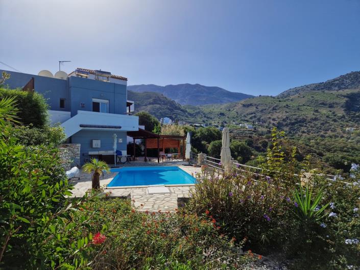 Available for sale is this property, located in a quiet area in the village of Mathes Apokoronas, with fabulous panoramic sea and White Mountain views! The property is located on a shared plot but has its own private fenced outdoor area with a garden and a swimming pool. It is a semi-detached home but due to its splendid location on the property, it is quiet and private.