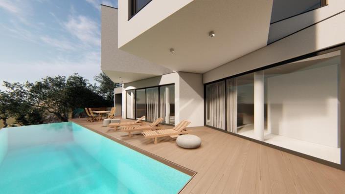 Building land of ??411 m2, in a quiet location, approx. 300 meters from the sea and the beach, Omiš Riviera, with a valid building permit for a villa with a pool of a total area of ??415 m2, construction can be started immediately, beautiful view of the sea and islands, access by car, water and electricity connections next to the land.