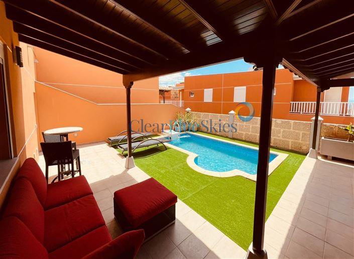Clear Blue Skies is pleased to offer this fantastic opportunity to purchase a four bedroom air conditioned semi-detached villa with private swimming pool in the popular complex of Mesetas del Mar in Los Cristianos.