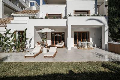 Beautiful Scandinavian-style townhouse surrounded by a tranquil garden and located in a double gated community in the heart of the golf valley. The residence is conveniently situated within walking distance of both Magna and Los Naranjos golf courses, making it a haven for golf enthusiasts seeking the perfect getaway. Boasting a contemporary design, the modern apartment seamlessly combines minimalistic aesthetics with the warmth of wooden carpentry. The result is a harmonious blend that permeates the entire living space, creating a cozy and inviting atmosphere. The highlight of the property is its spacious terrace, featuring a dedicated dining and lounge area. This outdoor haven provides an ideal setting for al fresco gatherings, allowing residents to bask in Marbella's delightful climate throughout the year. Key features of this elegant townhouse include an outdoor kitchen and BBQ area, an outdoor bath, a private garden, underfloor heating in bathrooms, bespoke carpentry, and a thoughtfully designed open-plan kitchen. Residents can also enjoy the benefits of a communal pool, adding to the appeal of this refined living space. Furthermore, the townhouse offers practical amenities such as proximity to essential services and golf courses. Security is paramount, with the property located within a double-gated community featuring a dedicated security guard. Convenience is further enhanced with the inclusion of one garage space. In summary, this townhouse is perfect of modern living, sophisticated design, and a serene location, making it an ideal choice for those seeking a luxurious and comfortable residence in Marbella's prestigious golf valley.