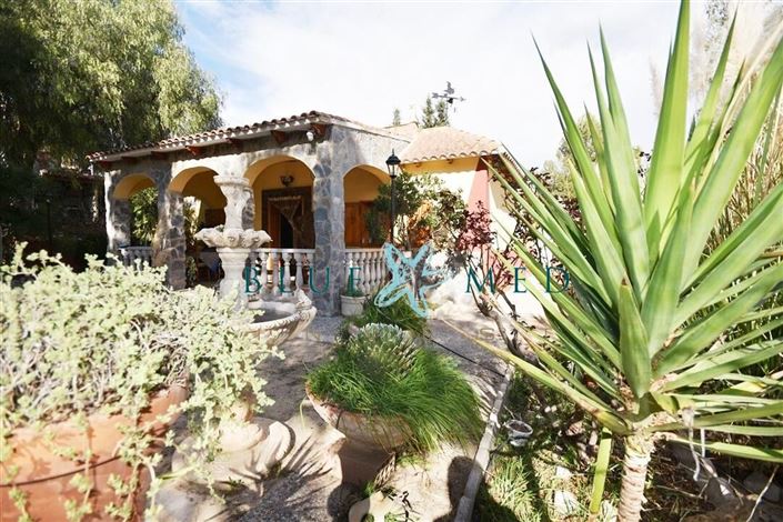 ~Chemin de terre depuis la route jusqu'au parking optionnel, à un niveau supérieur de la maison.~Descente vers un jardin décoratif avec une grande variété de plantes et d'arbres, devant la maison.~La maison dispose d'un salon-salle à manger avec d'un côté une cuisine américaine équipée, de l'autre un foyer au bois, ainsi qu'un poêle à granulés.~À l'intérieur, on retrouve une salle de bain familiale complète et deux immenses chambres avec leurs fenêtres.~Dehors encore, il y a un chemin qui descend vers des jardins décoratifs, avec sa cuisine et son four d'été sous pergola, et une remise à outils (vous pouvez ajouter un deuxième étage (avec un escalier)). Derrière, il y a un espace cage pour animaux, débarras, entrepôt, serre, stock de bois pour la cheminée et plus d'espaces verts.~Appelez-nous à BLUE MED INVEST~
