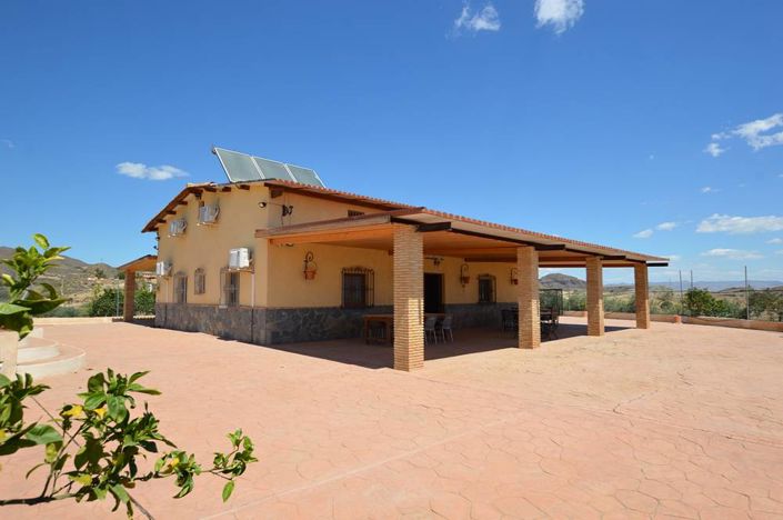 Outside, there are extensive terraces with stunning views across the surrounding countryside, towards the Sierra Cabrera mountains and even distant coastal glimpses. A large water deposit is in place for irrigation, supporting the many olive trees on the land.