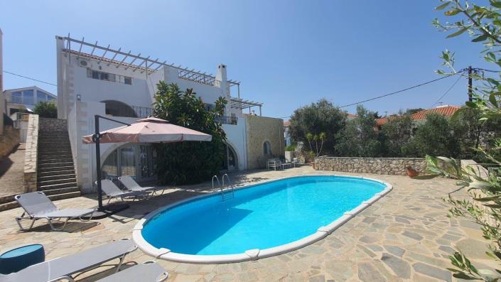 A beautiful detached house with a garden, private pool and unspoiled views of the sea and white mountains close to Plaka Square. The main house consists of two floors which are very spacious. Upon entering the property, it offers an open sitting room with a beautiful fireplace, a spacious dining room and a modern practical kitchen. All patio doors lead to large terraces, partly covered. A double bedroom with en suite bathroom and a guest toilet is accessed along a hallway.Magnificent sea or mountain views from all rooms. A comfortable staircase takes you to the second floor where there are two family bedrooms, both with en suite bathrooms with modern showers and access to a spacious communal veranda with spectacular views. The modern house offers some beautiful traditional features such as stone arches separating the living room from the dining room and kitchen, the wooden beams in the living room give extra character and make it a truly unique property . On the ground floor there is a spacious apartment with an open bright living room, dining room and kitchen, with a really modern and minimal architecture. Next to it you can find the two spacious bedrooms and a bathroom with a shower. From the living room you can access the beautiful swimming pool and an olive grove garden. In addition to these living spaces, on the ground floor there is a spacious storage room and garage. The property is fully fenced. -----The house 200m² living area + 300m² terrace area • Completely renovated in 2020-2021 • Fully equipped kitchen area • Cosy dining and living area (incl. 2 sofa beds) • Smart TV & WiFi • 3 airconditioned double bedrooms • 3 en suite bathrooms (shower, hairdryer) • Guest toilet • Laundry room • Stunning seaview from most of the rooms • Outdoor pool (37m², sweet water) • Surrounding garden with a.o. citrus trees and olive orchard THE APARTMENT 130m² living area + direct access to pool area incl. 140 m² terrace area • Completely rebuilt in 2021 • Fully equipped kitchen area • Cosy dining and living area (incl. 1 sofa bed) • Smart TV & WiFi • 2 airconditioned double bedrooms (+ 1 sofa bed) • 1 spacious bathroom (shower, hairdryer, laundry machine) • Outdoor pool (37m², sweet water) • Surrounding garden with a.o. citrus trees and olive orchard