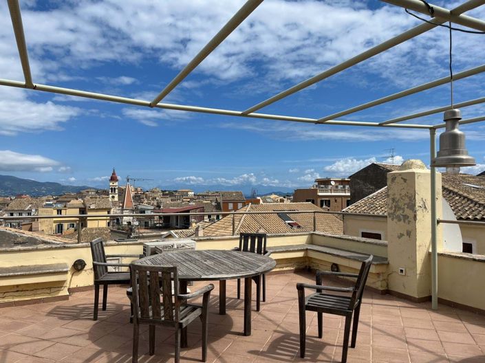 The kitchen has a door outside, with steps leading up to the magnificent roof terrace. The views from here are stunning, looking out over all of the old rooftops towards the sea and mount Pantokrator in the distance. Both the new and old fortresses are within sight, as is the imposing bell tower of St Spyridon church.