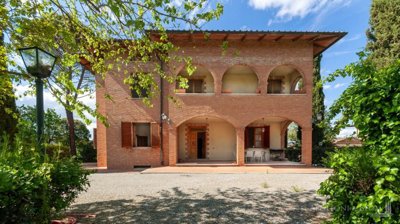 In a peaceful compound, brick and loggia villa on three floors with a garden and garage for sale exclusively with Apolloni & Blom in Montepulciano, Siena. This terracotta-brick villa spreads over 370 square meters (3982 sq ft) on three floors, two of which are above ground, and features two arched loggias on the façade, one on the ground floor and one on the first floor, as well as generous rooms and classic finishes. The porch leads to the main entrance with an atrium and central staircase to the different floors. The ground floor living area boasts elegant granite floors, double-glazed wooden fixtures and fittings, a fireplace in the main living room, an eat-in kitchen, a study, a bathroom, and a storage room. Upstairs, there are five bedrooms with parquet floors; the master bedroom has an en-suite bathroom, and two rooms have access to the loggia overlooking the garden. The central staircase leads directly to the basement, where two cellars are perfect for both pantry and storage, the technical room, and the garage of approximately 85 square meters (914 sq ft) with access from the garden driveway equipped with an automatic gate. Excellent housing solution for large families in a quiet residential area, close to stores and services, in the heart of Valdichiana. PROPERTY Ref: MTP3026Location: Montepulciano, Province: Siena, Region: TuscanyType: 368 sq m/3961 sq ft three-story brick villa with porch and loggias, spacious basement garage, garden Year of construction: 1980Condition: goodLand/Garden: 800 sq m/8611 sq ft, fully fenced and with automatic gateTerrace/Balcony: a porch on the ground floor and a loggia on the first floorParking space/Garage: 85 sq m/914 sq ft basement garageLayout: