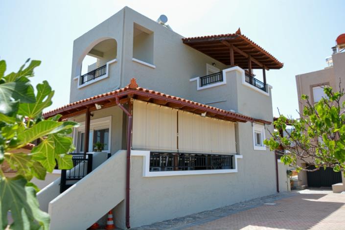 Beautiful maisonette at Milatos, very close to the beach, is offered for sale. Build in 1985 and newly renovated in 2004. The ground floor comprises 3 bedrooms and 2 bathroms, each room with access to a balcony. A fully equipped kitchen and a living - dining area with a fire place. Storage room for washing machine, a modern bathroom. The apartment has about 100m². The first floor offers two individual apartments, each with about 70m² . Both apartments offer one bedroom, a fully equipped kichen with fitted in cupboards and a living / dining area, plus a modern bathroom. Balconies offering undisurbed view to the surounding area and to the sea side. Each apartment has its own solar heating system. Outside BBQ area, private parking space, air conditioning in each room, saftey security system and garden area. A beautiful, very well maintenanced property in a quiet area of the traditional village of Milatos, only 400m distance to the sea side.