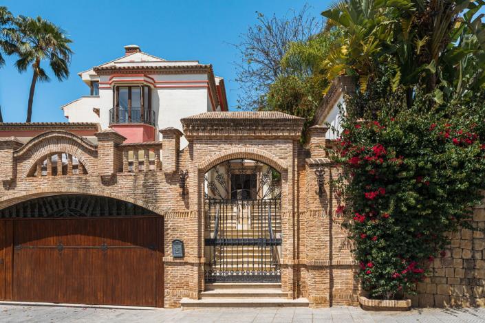 This magnificent 5-bedroom villa is located in Altos de Puente Romano, an exclusive residential complex in the heart of Marbella’s renowned Golden Mile. Known for its luxurious, comfortable, and secure environment, this prime location is just minutes away from beautiful beaches, Michelin-starred restaurants, designer boutiques, trendy nightclubs and beach clubs, supermarkets, first-class leisure and sports facilities, including popular golf courses and tennis clubs, and the legendary luxury hotels Marbella Club and Puente Romano, from which the complex takes its name. Marbella’s charming Old Town, the Golf Valley, fabulous Puerto Banús, and international schools are also only a short drive away.Surrounded by lush subtropical vegetation and other luxurious Golden Mile properties, this classic Andalusian grand villa spans 1,107 m² and sits on a private plot of 842 m². It offers 5 bedrooms, 5 bathrooms (4 en suite), and 2 guest toilets. The living space is spread over 5 floors, including a basement, all connected by a lift. The mansion features an entrance hall, a large living room with an antique marble fireplace and direct access to the garden and saltwater swimming pool. It also has a separate dining room, a fully fitted kitchen with a sunny breakfast area, a guest toilet, and a guest bathroom. The terrace offers partial sea and mountain views.At street level, the semi-basement is accessed via an elegant wrought iron gate and a marble staircase. This level includes a garage, a machinery room with a water tank, a store room, a laundry room, and a staff flat. A corridor leads to a spacious games room with a billiard table and TV room, a wine cellar, an indoor heated swimming pool with dehumidifiers, a Turkish bath, a sauna, and a hydro-massage shower. The villa features thermal insulation and waterproofing systems, arabesque tiling, travertine bathrooms with friezes, double-glazed Climalit anti-theft windows, a home automation system, and more.