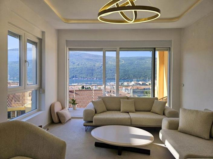The apartment features two bedrooms, a modern bathroom, and an open kitchen that connects to a spacious living room, leading out to a large loggia. From the loggia, you can enjoy views of Porto Novi, the surrounding mountains, and the bay. The area nearby is set for future development, including plans for hotels, a spa, and sports facilities. Porto Novi is just a seven-minute walk away, and the sea is only 300 meters from the apartment.
