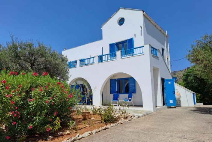 Exceptional 4 bedroom, 3 bathroom villa with pool, olive grove, protected panoramic sea and mountain views in a private location, walking distance to Gavalachori village. Decorated and furnished beautifully in traditional Cretan blue and white, this is literally the dream Greek villa you immediately picture when thinking about a home in Greece.
