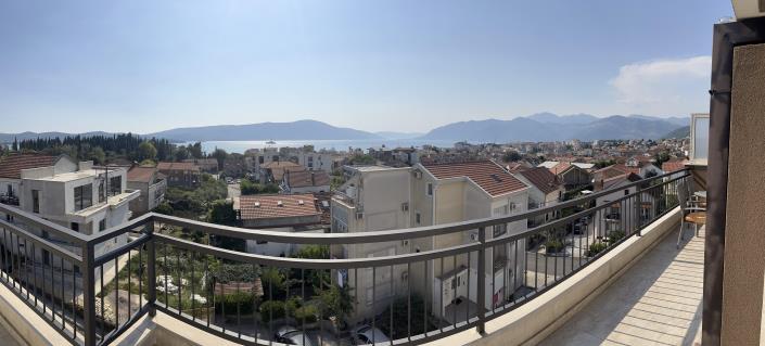 I am selling a penthouse that stands out with its panoramic view of the Bay of Kotor. This luxuriously decorated three-bedroom apartment has 99m2 and is located on the fourth floor of the building. The apartment has a comfortable open-plan living room, connected to the dining room and a modern kitchen with all the necessary appliances, three elegant bedrooms, two bathrooms, a laundry room and a big terrace that extends around the entire apartment. All rooms have access to the terrace and the view extends to the sea on one side and the mountains on the other. Every room in the apartment is equipped with air conditioning and the bathrooms have floor heating. The apartment is fully furnished and enriched with modern design and high-quality materials. It is located in the immediate vicinity of the center of Tivat, Porto Montenegro, nearby beaches, shops, restaurants, cafes and other essentials needed for a pleasurable life. This residential building was built in 2017. The apartment has a parking space.