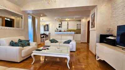 The layout includes a hallway, a large and a small bathroom, two bedrooms equipped with custom-made wardrobes, a kitchen with a bar, a dining room, and a living room. The apartment also has two terraces with a view of the city. The furniture in the apartment is of the highest quality, the kitchen is built to measure from special materials and with appliances of well-known brands, so this apartment represents the ultimate combination of comfort and luxury.