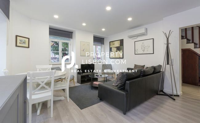 The structure consists of two independent, fully furnished and equipped flats. On the first floor, there is a T1+1 Duplex that features air conditioning. On the ground floor, two shops have been converted into a spacious one-bedroom apartment. Both flats include a fully equipped kitchenette equipped with a hob, oven, fridge, dishwasher, microwave, toaster, coffee machine, and kettle. As corner flats, they benefit from excellent natural light, creating a cozy atmosphere.