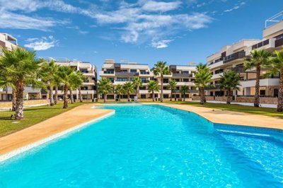 La propriété sera vendue entièrement meublée et se compose dun salon / salle à manger spacieux, dune cuisine ouverte moderne entièrement équipée, de deux chambres avec placards, de deux salles de bains (dont une en suite), des portes-fenêtres du salon donnent également sur une terrasse privée pour profiter du soleil espagnol toute la journée. Une place de parking et un débarras dans le garage souterrain sont également inclus dans le prix.