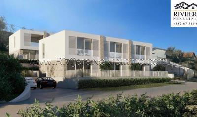 Nearby, you can find seafood restaurants and beaches (Movida, Niki Beach, Blue Horizon). The airport is 5 km away, Tivat is 7 km away, and Kotor is 5 km away. The first building consists of three townhouses, each 100 m², priced at 240,000 euros. The second building has four townhouses, each 90 m², priced at 200,000 euros.