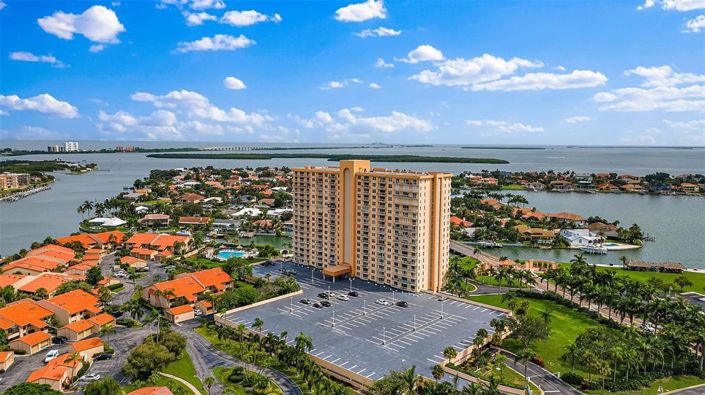 Just Reduced!! Completely redesigned and renovated luxury condo with views of Boca Ciega Bay, located in the award-winning 55+ community of Point Brittany. This luxury condo features an open concept kitchen with a gorgeous large island which is great for entertaining and eliminates the need for dining room table and chairs. The ceiling height cabinetry provides maximum storage space. The designer bathroom is very large with double sinks and a two person, two separate showerheads shower. Both the kitchen and the bathroom have quartz countertops. The beautiful porcelain flooring is complimented by everyone who sees it. Additional features and updates include Vinyl sliding impact door, hurricane impact windows, cabinets, floors, walls, a/c, water heater, and motorized room darkening shades in both the living room and bedroom. You'll love morning coffee or a cool beverage in the sea breeze and enjoy bay views on the covered balcony. Bayway Isles Point Brittany has four pools, a hot tub, and a clubhouse with a catering kitchen, fitness center, library, cards and billiards rooms, a yoga studio and an arts and crafts room. The complex also offers fishing piers, tennis/pickle ball courts, shuffleboard, Electric Car charging stations, grilling areas, kayak storage and a marina with boat slips available on a 1st come basis. The condo association recently completed the required Structural Integrity Reserve Study (SIRS) as well as the required Milestone report. Nearby Isla del Sol Yacht and Country Club (private memberships available) with 18 hole championship golf course and marina. Easy access and minutes to Gulf Beaches such as St Pete Beach, Fort de Soto Park, Pass-A-Grille. Easy access to the interstate and 10 minutes to downtown St. Petersburg with many museums, shops, restaurants, theaters and nightlife. 30 minutes to Tampa International Airport.