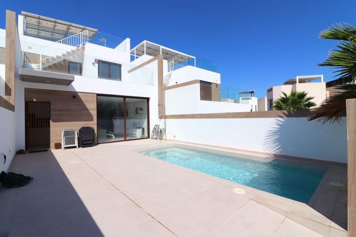 This stunning, almost-new east-facing townhouse in Benijofar offers modern living in a prime location just a short walk from local amenities. Perfectly blending contemporary design with energy efficiency, this property is ideal for those looking to enjoy the Mediterranean lifestyle while benefiting from the convenience of nearby shops, restaurants, and services. With three spacious bedrooms, a private pool, and an outdoor kitchen, this townhouse provides a luxurious yet low-maintenance home in the heart of Costa Blanca.