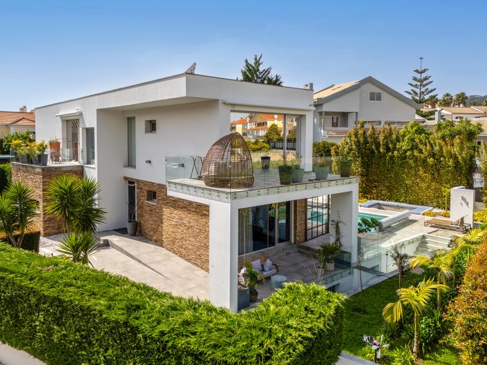 The upper level features three en-suite bedrooms, complemented by two additional bedrooms on separate levels and an open office area, ideal for flexible family living. The fully equipped kitchen flows seamlessly into a striking double-height living room with a fireplace, connected to the outdoor area that features a swimming pool, landscaped garden, and fire pit. This villa is a unique blend of functionality, luxury, and entertainment all in one of Sintra’s most private and sought-after settings.