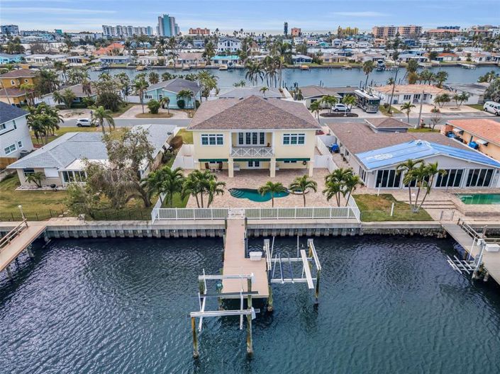 Built-to-last above base flood elevation with all block construction and poured concrete floors, you’ll appreciate the peace of mind offered by this exceptional waterfront residence. A spacious brick paver driveway, generous 6-car garage parking, and two 10,000 lb boat lifts make this the perfect place for your vehicles and watercraft. Driftwood-style porcelain floors, lovely crown woodworking and tall 10ft-high ceilings introduce a wonderful open floorplan with beautiful views of the waterfront. Your spacious living room opens to an elegant 225sqft covered balcony with a built-in electronic sunshade. Fabulous chef’s kitchen boasts fine quartz counters/backsplash, rich coastal cabinetry, huge wrap-around multi-level breakfast bar, under and above cabinet lighting, and pantry closet. Double doors open to a fabulous waterfront owner’s suite that opens to the waterfront balcony and features two walk-in closets with built-in dressers. Owner’s bath provides dual quartz vanities and an exquisite designer walk-in shower with seating bench. Second bedroom is oversized and en suite, and has a graceful bath with jetted tub and shower. Third bedroom is spacious and has a walk-in closet with adjacent full guest bath. Out back discover a huge 470sqft covered deck that transitions to a large paver area with a gorgeous Pebbletech Pool/Spa. Deck offers lots of lounging space and covered outdoor dining. Updated seawall supports a composite dock with two boat lifts. Bahamian shutters on the outside, plantation shutters on the inside, large and well-finished laundry room with extensive cabinetry storage, lower-level multi-purpose area, large 8ft-high elevator, PVC privacy fencing, and so much more. Located within easy walking distance of the beach, dining and entertainment. An outstanding value in an excellent waterfront boating community! Buyer to verify all dimensions. Bathroom Mirror does not Convey.