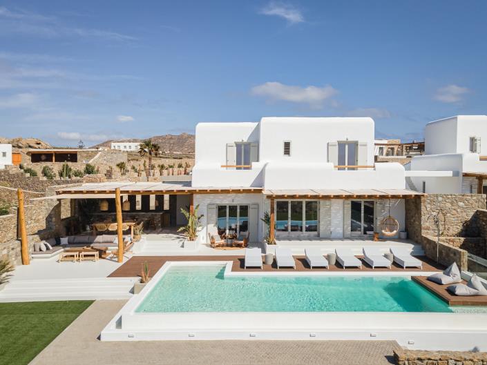 Strategically located, the villa is approximately 10 km from Mykonos Town, 11 km from Mykonos Airport, and 11.5 km from Mykonos Port. It benefits from a tranquil neighborhood setting and is free from shared expenses.