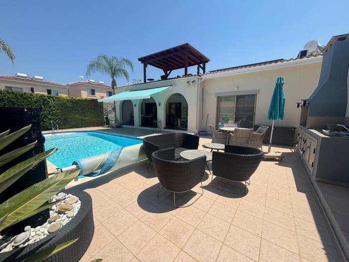 Outside there is an extensive patio area surrounding the private swimming pool (9m x 4m) with Roman steps, outside shower with hot and cold water, outside kitchen with dining area, the perfect place to enjoy al fresco dining, covered and uncovered patio areas, beautiful, mature landscaped gardens, a separate building, ideal as an office/craft room or utility, utility room, storage room and gated driveway with carport and parking for three/four vehicles. A staircase leads up to an amazing roof terrace offering superb views along the Paphos coastline.