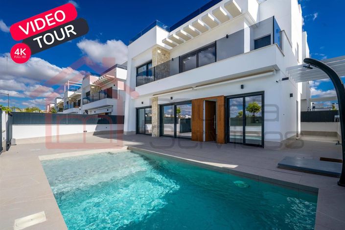 Beautiful resale detached villa in the fabulous Santa Rosalia Lake and Life Resort. The villa is totally encloses with private gate and driveway and has its own pool. On the ground floor there is an open plan lounge/dining/kitchen area, a double bedroom with sliding glass doors leading out to the garden and an en-suite. Upstairs there are two double bedrooms both with en-suites and access to the sun terrace, stairs leading up to a toilet and roof solarium of 48 m2. There is a basement of 91 m2 with glass sliding doors out to a patio area.