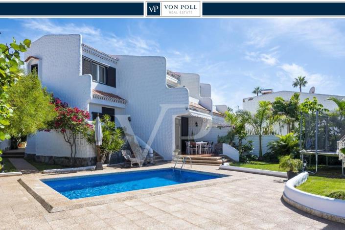 These two exclusive and charming properties are located in the heart of Playa de las Américas, in an oasis of peace and tranquillity and only a few steps from the sea. Two semi-detached houses, connected to each other and distributed over two floors. Each of them has an independent entrance, a private heated pool and beautiful tropical gardens. Each property offers three bedrooms, three bathrooms, making a total of six bedrooms, six bathrooms, of which four are en-suite. There are several terraces with beautiful sea views. The distribution of the properties are similar and as follows: The entrance offers a covered terrace, which leads to a spacious living room, a dining room, a fully equipped kitchen, a full bathroom and a guest room with its own terrace. The upper floor offers a second guest room, with an en-suite bathroom and an independent entrance reached by an external staircase. This area is completed by a large master suite with bathroom and its own terrace with magnificent views of the sea and the island of La Gomera. A large garage with a lot of capacity and with an automatic door completes this incredible property. If you are looking for a property for investment or for your own use, this is your opportunity. The property has a touristic license.