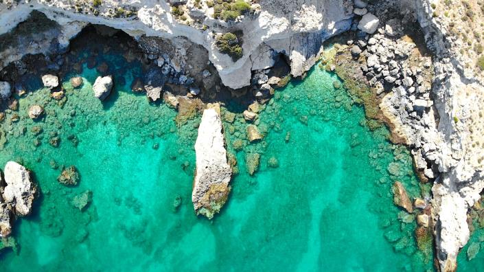 The sea at Kalathas is calm and crystal-clear, shimmering under the Cretan sun with hues that shift from pale aquamarine near the shore to deep sapphire further out. It’s a bay that breathes tranquility — sheltered and pristine, yet full of quiet life, where time seems to slow down with every wave.
