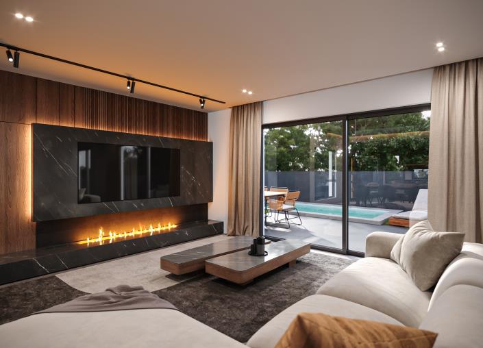 Spanning three levels (basement, ground floor, and mezzanine), it features 5 bedrooms, 4 bathrooms and 1 WC, 2 kitchens, and multiple living areas. Generous private terraces and a private pool invite you to relax in total privacy. Underfloor heating and VRV air conditioning system in all main areas ensure year-round comfort.