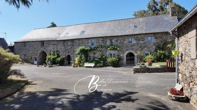 Au coeur de la campagne bretonne, à 15 mn de la mer, se dévoile ce manoir et ses dépendances. Né au XIVe siècle, ce joyau d'architecture en granit et schiste se distingue par un porche monumental traversant les bâtiments en biais, une signature unique qui ouvre la voie à une cour intérieure, théâtre de la vie du domaine depuis des générations.