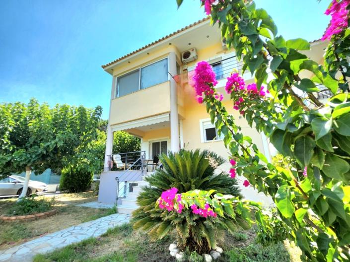 In the seaside village of Elaionas, just 300 meters from the beach, this exceptional furnished maisonette is for sale, arranged over two levels (raised ground floor & 1st floor) with a total area of 120 sq.m., built in 2008, set on a corner plot of 280 sq.m. with a garden, private parking, and BBQ. The property features 3 bedrooms with fitted wardrobes, a spacious open-plan kitchen-living room with a fireplace, a bathroom, and a WC, and is offered fully furnished and equipped with electrical appliances, 4 A/C units, garden furniture, and 2 bicycles. Additional features include autonomous oil heating with floor-by-floor control, aluminum frames with double glazing and insect screens, security door, tiled flooring throughout, alarm system, boiler, pitched roof, and an internal staircase. A key advantage is the separate semi-basement storage room with natural light, its own entrance, and a covered oil burner in the courtyard. Located in a quiet area with mountain views, just a 2-minute walk from the sea and 6 minutes from the village center, this property is an ideal choice for a permanent residence or holiday home.