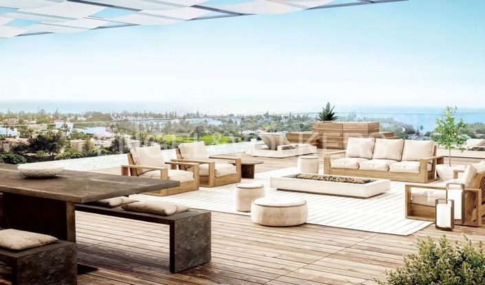 Vendu entièrement équipé et meublé, cet appartement lumineux et spacieux, au design contemporain et aux finitions de haute qualité, allie élégance, confort et fonctionnalité. Il se compose d'un salon et d'une salle à manger en plan ouvert, une cuisine entièrement équipée et trois chambres en suite avec des placard. Il a également accès, depuis toutes les pièces, à une terrasse spacieuse d'env. 75M2. Il bénéficie également d’un toit-terrasse avec 121,65 m2 et piscine privée, parfait pour se détendre, profiter des journées ensoleillées et contempler la vue panoramique.