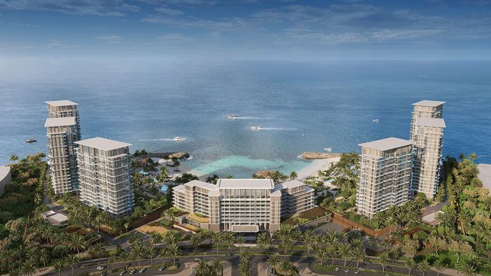 The project offers a sophisticated living experience with a mix of studio, 1-bedroom, 2-bedroom, and 3-bedroom apartments, totaling 3,302 units, each crafted to maximize comfort and modern style. Interiors feature high-quality finishes, including fitted wardrobes and fully equipped kitchens with premium white goods. The design emphasizes open, light-filled spaces, utilizing floor-to-ceiling windows that invite scenic views of the surrounding island and seascape. Neutral color palettes, luxurious stone countertops, and timber-look joinery create an elegant and serene atmosphere throughout each unit, while accent glass and modern lighting add a touch of refinement. Bathrooms are designed with premium fixtures, offering a spa-like experience at home, and living areas blend seamlessly into private balconies, creating a true indoor-outdoor lifestyle tailored for both relaxation and upscale living.