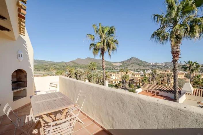The living/dining room features high ceiling with wooden beams, a fireplace, and patio doors opening to the main terrace. This terrace enjoys views to the Mar Menor and La Manga strip across the resort and includes a built-in BBQ—perfect for enjoying alfresco dinners.