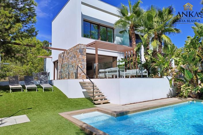 A sleek designer kitchen with integrated high-end appliances can be hidden behind a minimalist white wall, keeping the space refined and stylish. The bright living area flows directly to the outdoor terrace, dining area, private pool, and sunbathing zone, ideal for enjoying the Mediterranean climate. The master suite, complete with en-suite bathroom, also opens onto the garden. A guest toilet adds extra convenience.