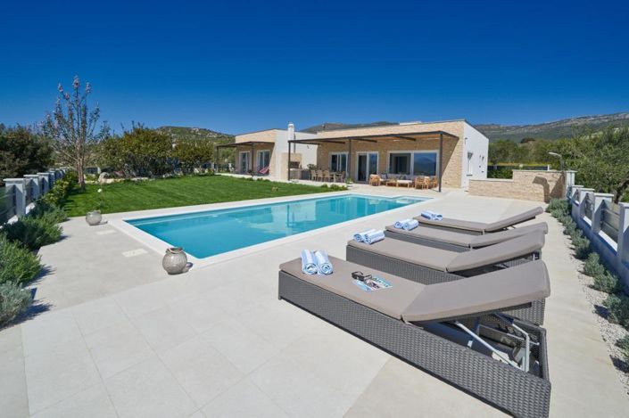 In the picturesque setting of Kaštela, there stands a splendid new villa, offering an exquisite blend of privacy and luxury. Nestled within a protected green zone where no further construction is permitted, this property ensures peace and solitude. Ideally situated between the historic cities of Split and Trogir, the villa lies a mere 1.5 kilometers from the sea and its inviting beaches, with all necessary amenities close at hand.This elegant single-story residence spans 180 square meters of living space, set upon a generous 1,012 square meter plot. The interior is a testament to refined taste and thoughtful design, featuring four expansive bedrooms, each equipped with a double bed, private en-suite bath, and individual air conditioning. The open-plan living area, seamlessly joined with a modern kitchen and dining room, exudes warmth and comfort—perfect for family gatherings and moments of quiet repose.Outside, the villa reveals a secluded haven of relaxation—a private swimming pool, encircled by sun loungers and garden furnishings, all framed by the lush greenery, with not a single neighboring home to disturb the serenity. It is a place designed for those who wish to savor long, sunlit days in complete seclusion.Moreover, the villa's location is further enhanced by its proximity to the renowned Sikuli Kaštel winery, just one kilometer away—adding a touch of indulgence to this already captivating setting.With vistas that stretch to the sea, the villa accommodates five parking spaces, including two covered slots. It is offered fully furnished, dressed in a modern yet timeless style, ready for immediate occupation.This property is a rare find, embodying the perfect harmony of luxury, tranquility, and convenience—ideal for those seeking a distinguished residence or a premier investment opportunity. Ref: RE-LB2259Overall additional expenses borne by the Buyer of real estate in Croatia are around 7% of property cost in total, which includes: property transfer tax (3% of property value), agency/brokerage commission (3%+VAT on commission), advocate fee (cca 1%), notary fee, court registration fee and official certified translation expenses. Agency/brokerage agreement is signed prior to visiting properties.