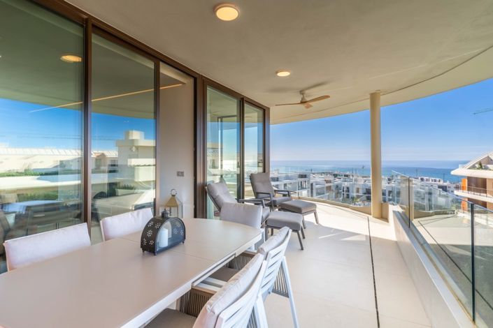 Cet appartement d'angle lumineux dispose d'une spacieuse terrasse enveloppante de 42 m², exposée au soleil du sud-est au sud-ouest. Les deux chambres bénéficient d'une vue dégagée sur la mer, tandis que le salon offre une vue imprenable sur les montagnes.