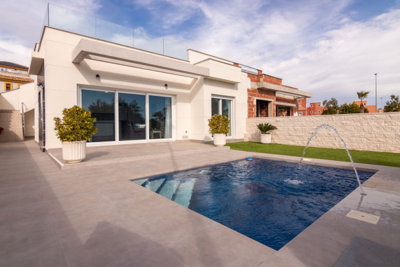 Herrada Hills is a new development of semi-detached villas in Los Montesinos. The properties comprise of three double bedrooms (the master leading to a private terrace, all with fitted wardrobes), two bathrooms (one en-suite), modern fully-fitted integrated kitchen (furnished in matt white with high finishes, including white goods) and spacious open-plan living/dining area, leading to the private Mediterranean-style garden (part of which could be converted to off-street parking), swimming pool and up to the 78m2 south-east-facing rooftop solarium offering magnificent views of the Mediterranean Levante and the lagoons of La Mata and Torrevieja.